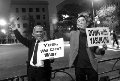 當(dāng)晚,位于東京的首相官邸周邊戒備森嚴(yán)。在首相官邸的斜對(duì)面,抗議民眾打出反對(duì)奧巴馬訪日、反對(duì)行使集體自衛(wèi)權(quán)、反對(duì)在沖繩新建軍事基地等標(biāo)語(yǔ)。