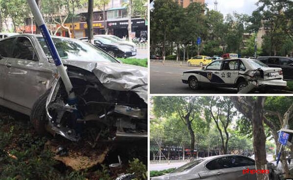 8月12日清晨7時40分時,昆明市環(huán)城西路與氣象路交叉口,一輛寶馬車突然撞向兩輛停在路邊的巡邏警車,又沖上綠化帶撞倒監(jiān)控桿,最后撞上行道樹才停了下來。所幸,沒有造成人員傷亡。