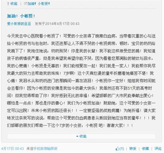 “愛小彬賢的豆豆”是女孩的微博名稱,她寫了一段話私信了邯鄲之窗微博,她記錄了看望小彬嫻的整個(gè)心理動(dòng)態(tài),她希望用自己的方式給予小妹妹精神上的支持與幫助,她愛小彬嫻,所以她會(huì)一直在小彬嫻身邊。