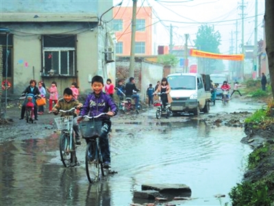 杜先生告訴記者,這個(gè)路段的積水已經(jīng)有很長(zhǎng)一段時(shí)間了,之前附近有一個(gè)排水坑,該段路的積水能很快排進(jìn)坑里。而現(xiàn)在排水坑被填平了,再加上這個(gè)路段兩邊高中間低,所以一下雨水就積在了路中間。中心小學(xué)正位于路中段,水出不去,這里長(zhǎng)年都處于一個(gè)積水狀態(tài),特別是前些天剛下了雨,積水就更深了。每天孩子放學(xué),家長(zhǎng)們不放心都要接送,可是水下面都是泥非常濕滑,一顛簸,年齡小的孩子時(shí)常會(huì)從車上掉下來,摔得渾身是泥。就此,杜先生還于昨日中午孩子放學(xué)時(shí)拍攝了一些照片,從照片中記者也看到,積水侵占了整個(gè)路面,背著書包的學(xué)生只能側(cè)身從兩邊積水少一些的地方溜過去,一些騎自行車的孩子也是涉水而過,讓人捏著一把汗。